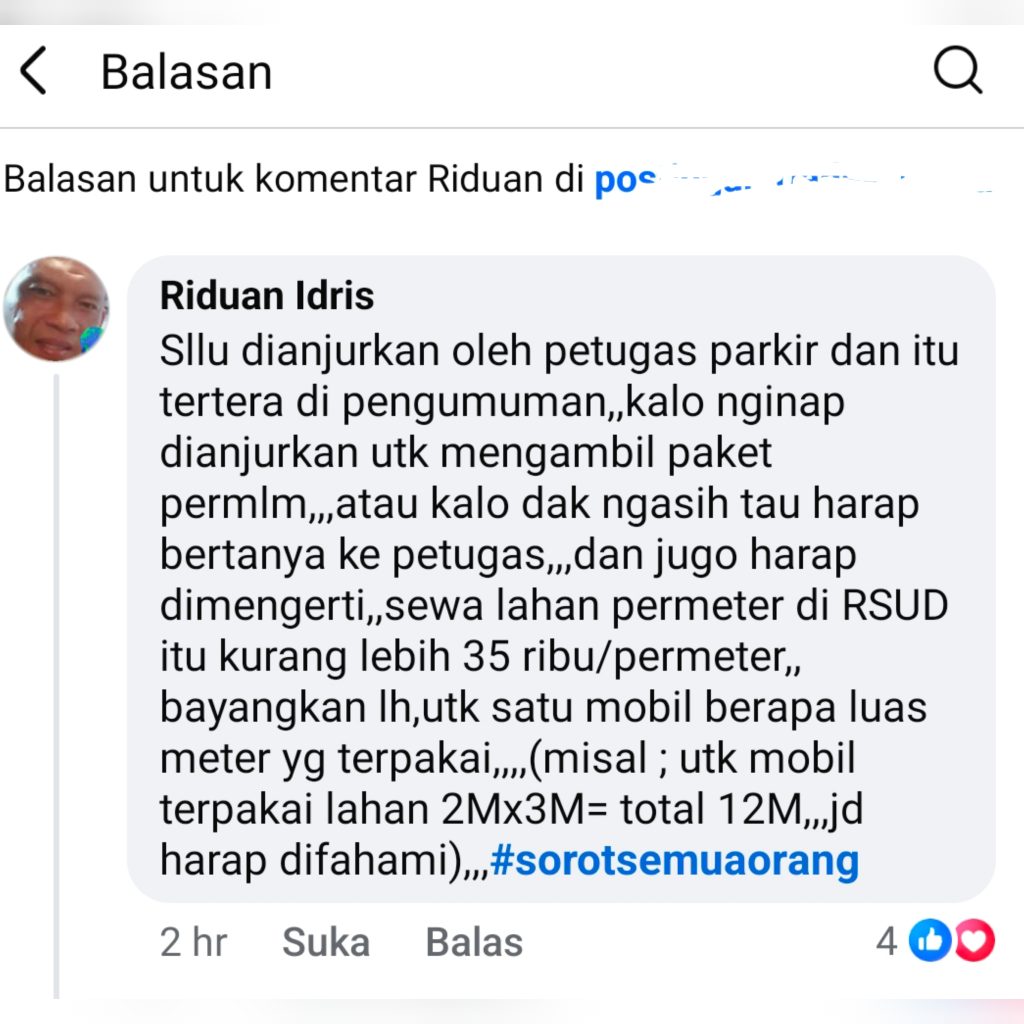“Mereka bayar 379 juta 800 ribu per tahun diluar pajak, bukan 450 juta seperti disebut salah satu pengelola. Saat ini dewan pengawas RSUD sedang rapat membahas tarif parkir tersebut. Jelasnya nanti tunggu hasil rapat Dewan Pengawas”. Tambah dr. Edi Mustafa