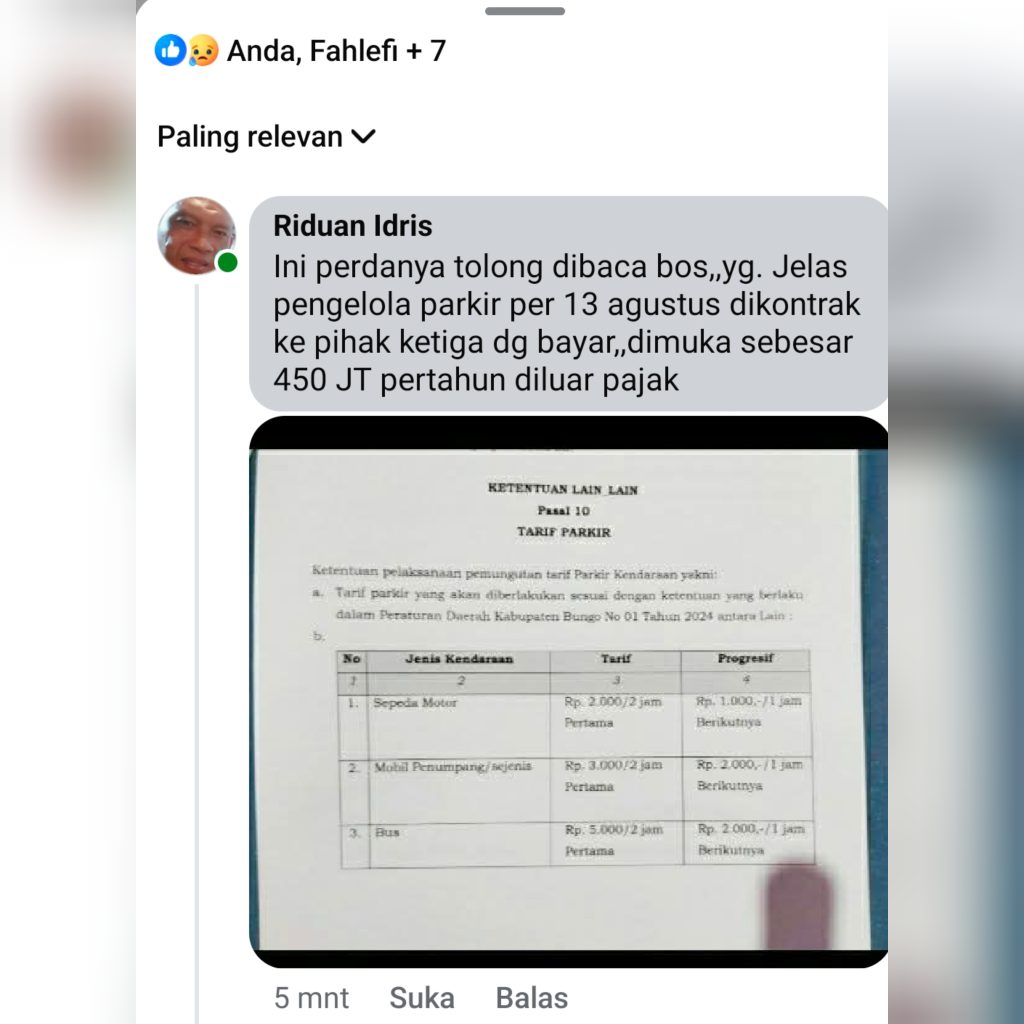 “Ini perdanya tolong dibaca bos,,, yg. Jelas pengelola parkir per 13 Agustus dikontrakan ke pihak ketiga dgn dibayar,, dimuka sebesar 450 JT per tahun diluar pajak”. Tulis akun @Riduan *****