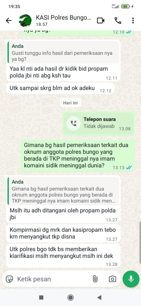 Dikonfirmasi melalui pesan WhatsApp pada Selasa (21/10/2025), Kasi Propam Polres Bungo menyampaikan bahwa kasus tersebut sudah ditangani langsung oleh Propam Polda Jambi.
