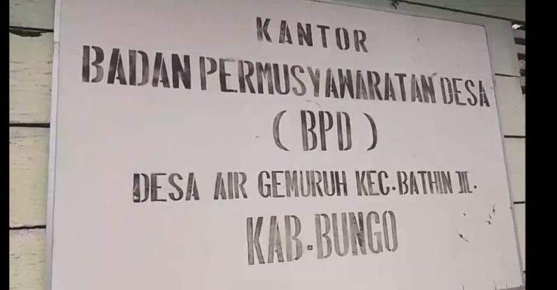 LANGITJAMBI, BUNGO_Beredar video yang memperlihatkan kondisi bangunan yang kantor Badan Permusyawaratan Desa (BPD) Desa Air Gemuruh, Kecamatan Bathin III, Kabupaten Bungo. Dalam video tersebut sumber menyebutkan bahwa kantor BPD tersebut dipenuhi kotoran sapi dan terlihat tidak karena tidak pernah dirawat.