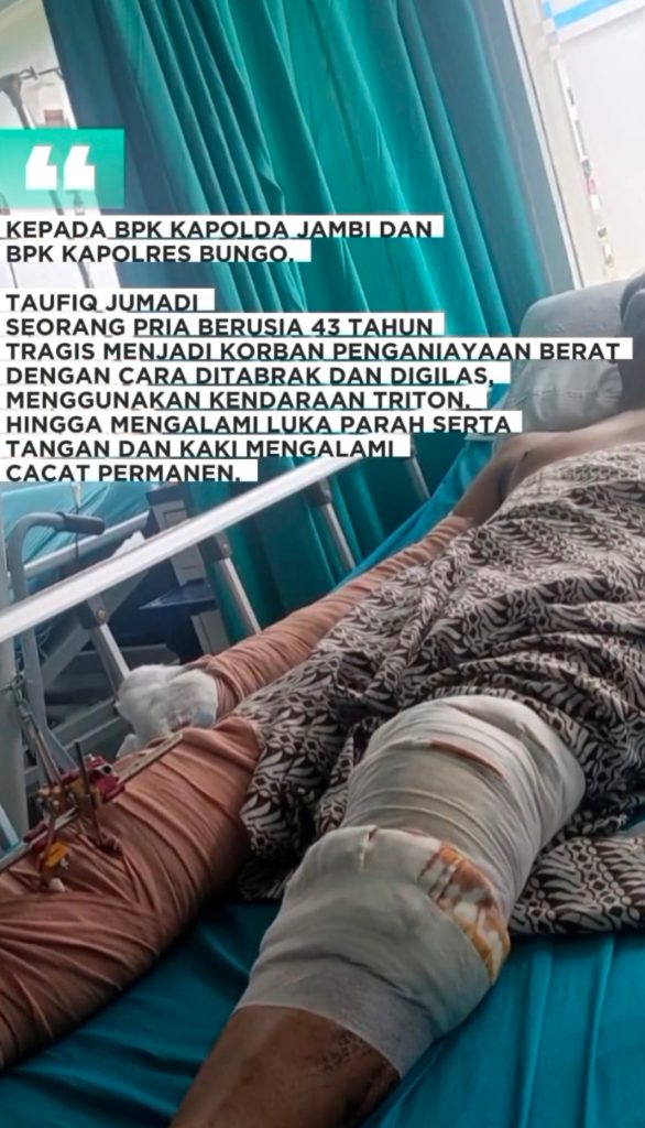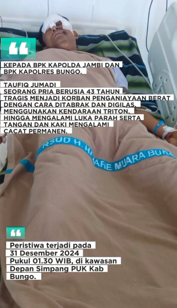 Taufik Jumadi merupakan korban penganiayaan yang terjadi pada 31 Desember 2024 di simpang PUK (kantor samsat). Akibat kejadian tersebut tangan dan kaki Taufik mengalami cidera serius yang membuat lumpuh permanen. Namun hingga hingga kini pelaku belum juga diamankan oleh pihak Polres Bungo.