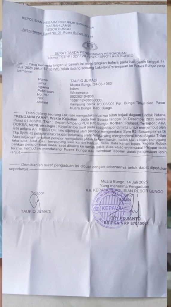 Selanjutnya Taufik mengatakan pasca kejadian tersebut dirinya sudah membuat laporan resmi ke Polres Bungo, pada 14 Juli 2025, dengan Nomor : STTP/327/VII/2025/SPKT/RES BUNGO. Namun hingga kini laporan tersebut tidak tau kelanjutannya, juga tidak ada titik terang proses hukum atas kasus tersebut, yang mana hingga saat ini pelaku masih berkeliaran.