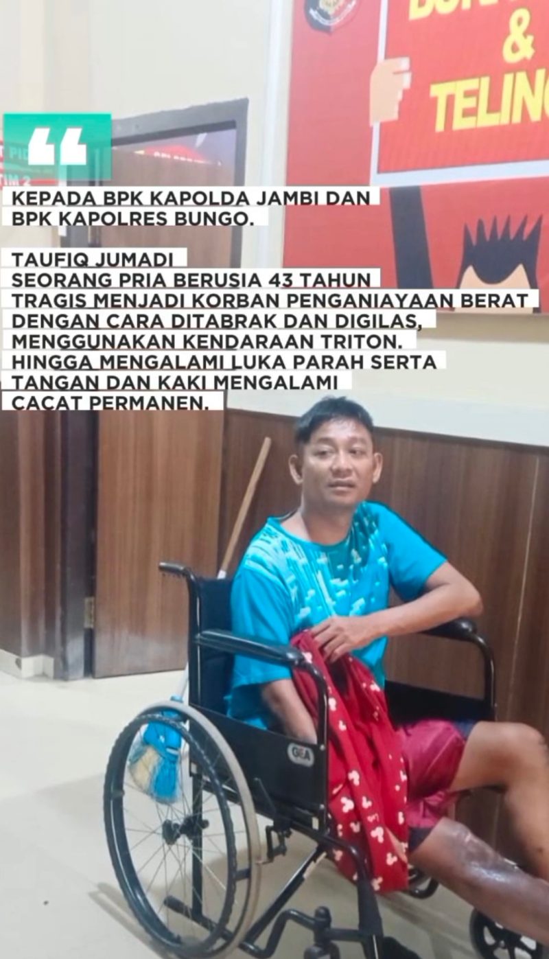 Taufik Jumadi merupakan korban penganiayaan yang terjadi pada 31 Desember 2024 di simpang PUK (kantor samsat). Akibat kejadian tersebut tangan dan kaki Taufik mengalami cidera serius yang membuat lumpuh permanen. Namun hingga hingga kini pelaku belum juga diamankan oleh pihak Polres Bungo.