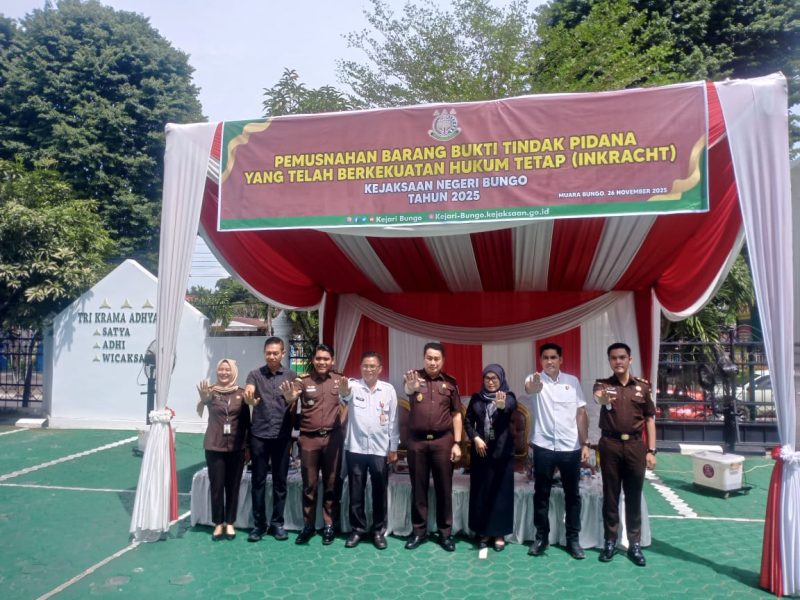 LangitJambi.Com, Bungo – Kejaksaan Negeri Bungo musnahkan barang bukti dari perkara tindak pidana umum dan tindak pidana narkotika yang telah berkekuatan hukum tetap (inkracht), pemusnahan dilalsanakan di halaman Kantor Kejaksaan Negri Bungo pada Rabu, (26/11/2025).