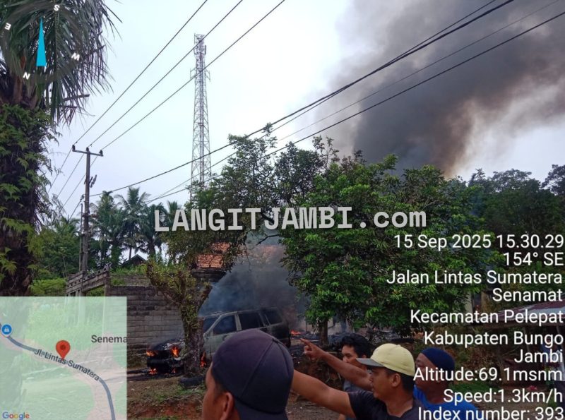 LANGITJAMBI, BUNGO, _ Kebakaran hebat terjadi Senin sore (16/09/2025) di Dusun Senamat, Kecamatan Pelepat, Kabupaten Bungo. Api menghanguskan satu rumah milik dan satu unit mobil panther minibus milik Agus.