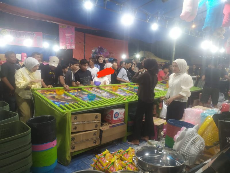 Stand tersebut diketahui menjual koin permainan dengan iming-iming hadiah berupa rokok dan sejumlah barang lainnya. Aktivitas ini menarik perhatian banyak pengunjung, terutama kalangan anak-anak dan remaja yang tampak antusias ikut bermain di lokasi.